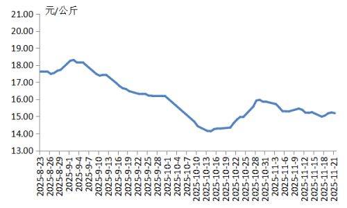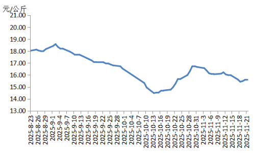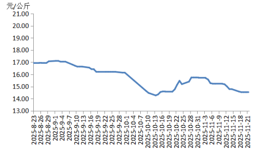 本周华东地区猪肉价格环比下跌,周内价格先下跌后上涨。周初规模养殖场和散养户出栏节奏正常,生猪及猪肉供应充足,猪肉价格延续下跌走势。周中后期,气温下降明显,猪肉消费增多,加之部分省份开启零星腌腊、灌肠活动,支撑猪肉价格小幅反弹,涨幅小于前期价格跌幅。