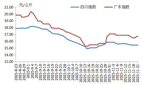 本周,广东地区猪肉周均价为每公斤16.58元,环比下跌1.7%,同比下跌26.7%,较上周跌幅收窄0.5个百分点。周前期规模养殖场出栏量正常,猪肉订单无明显增加,供需僵持,价格稳定在上周末低位;周后期随着气温下降,猪肉订单量小幅增加,支撑猪肉价格微涨,但涨幅有限。总体看,本周广东地区猪肉周均价环比小幅下跌。